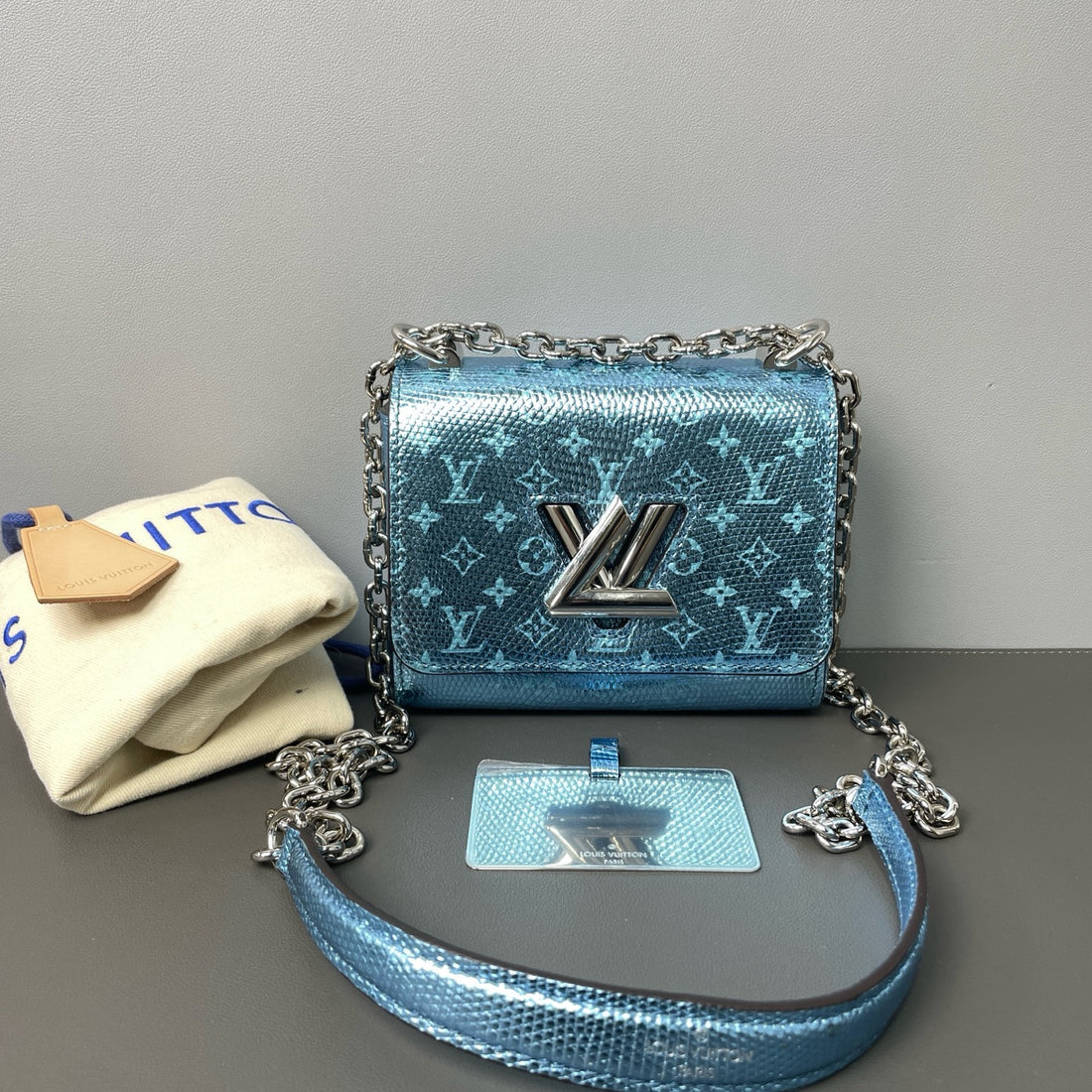 Louis Vuitton mini Twist handbag, made of lizard skin and decorated with a blue Monogram pattern.