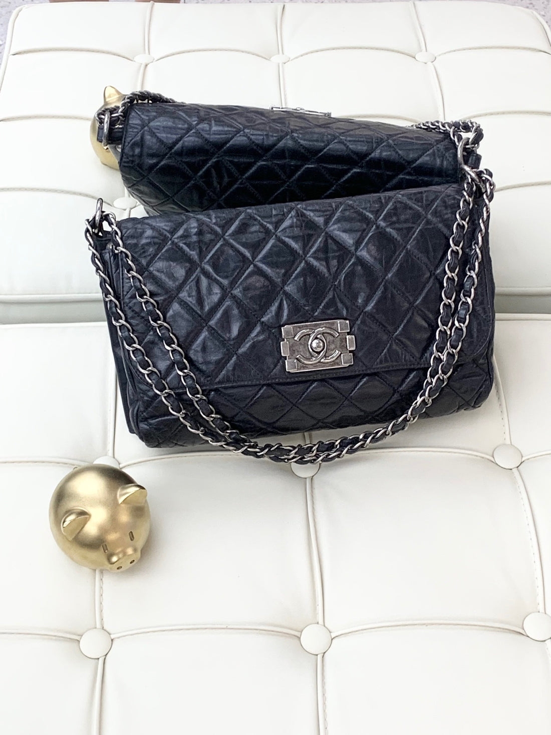 Chanel Bombay Collection Le Boy Black with Silver Buckle, Oil-waxed Calfskin Chain Bag