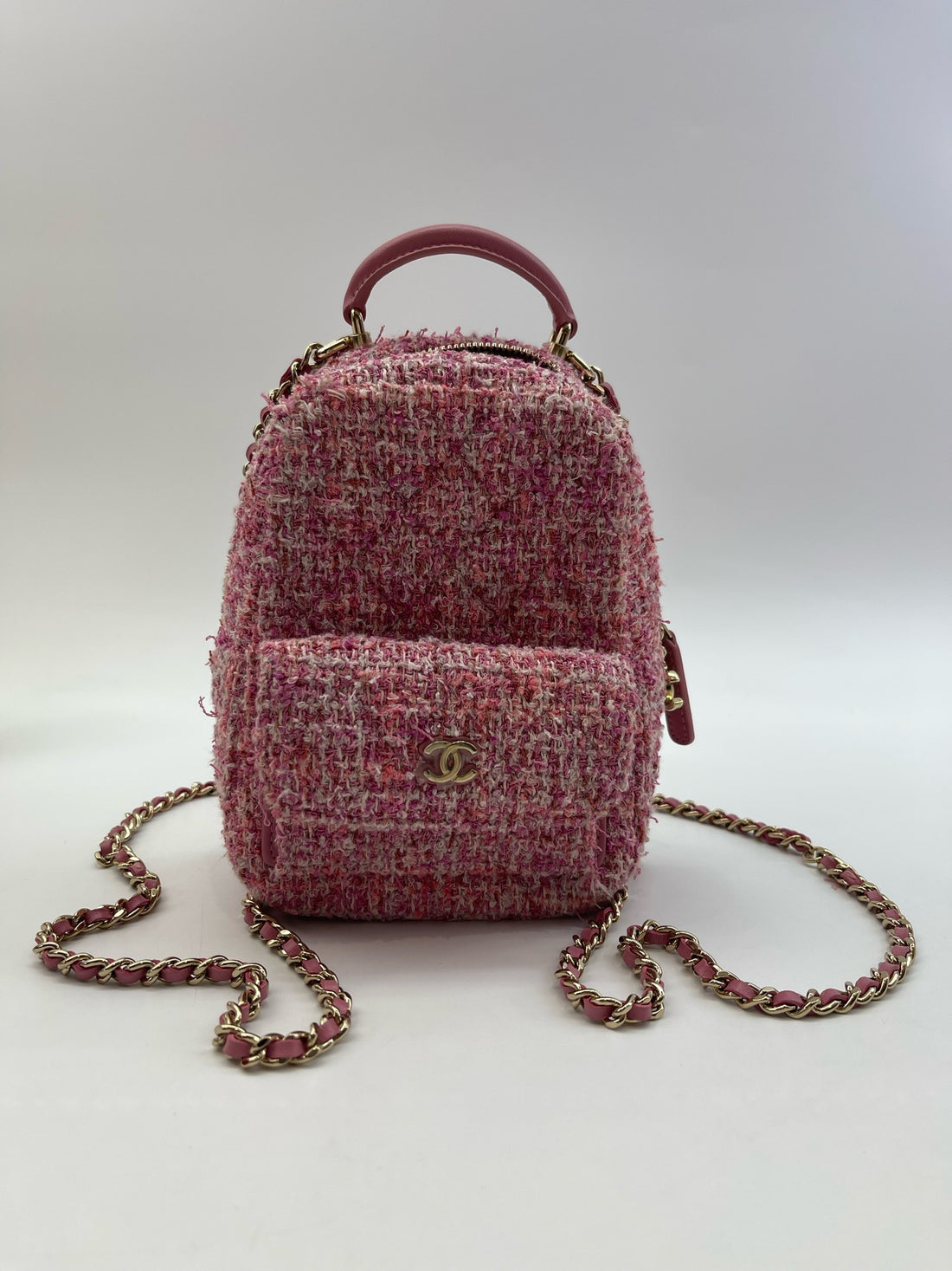 Chanel's classic mini backpack, made of pink tweed fabric, with gold-tone hardware.