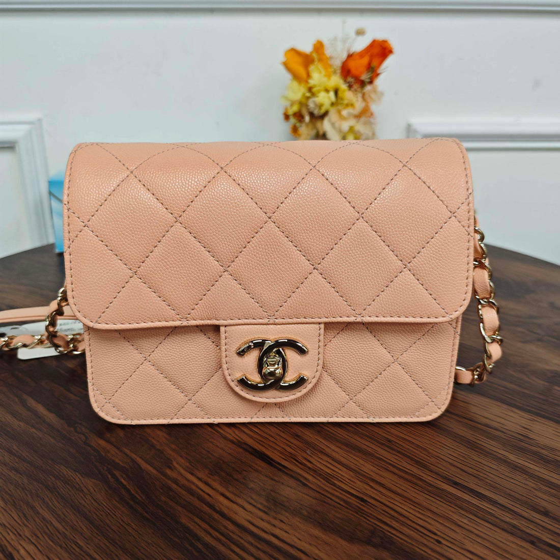 Chanel CF square Fat bag, light orange, pebbled leather, chain crossbody/shoulder bag.