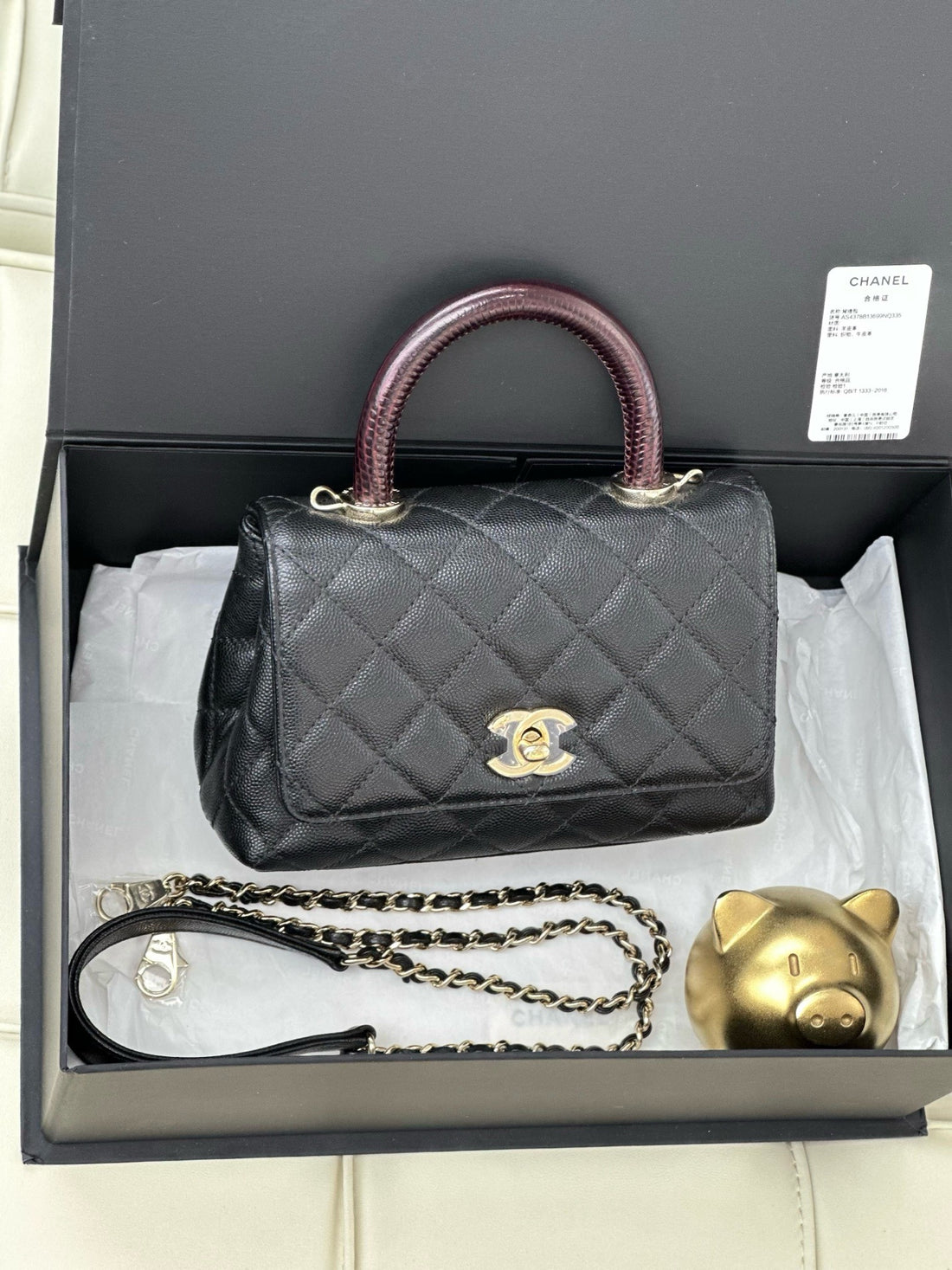 Chanel deep beige caviar/burgundy lizard skin cocoa handle with gold hardware