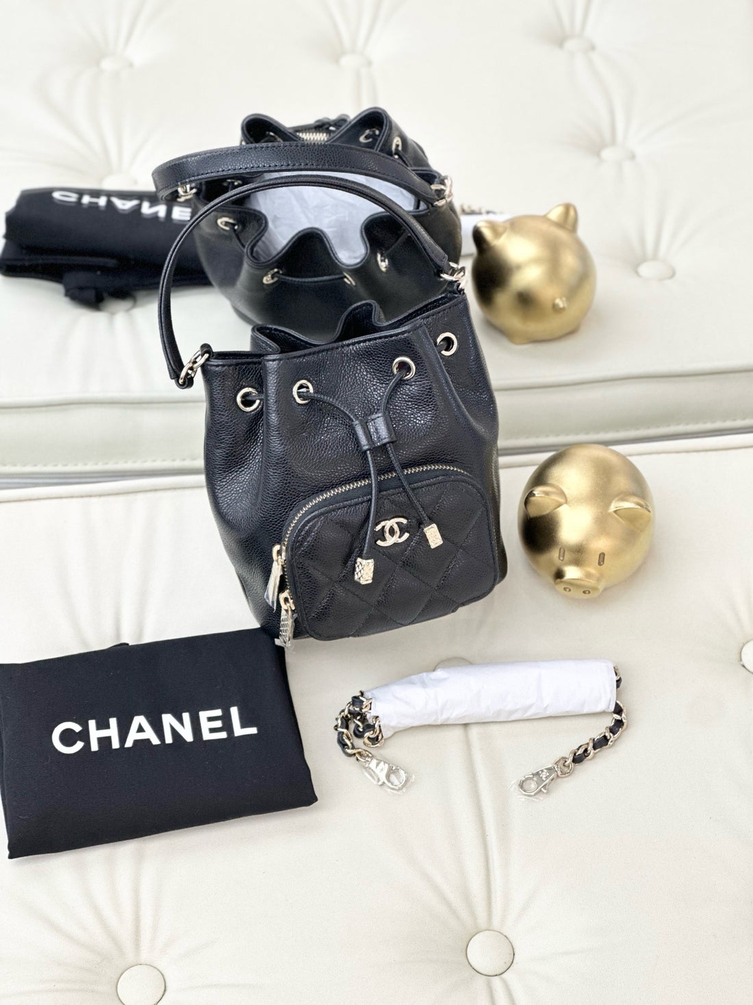 Chanel women's quilted shoulder bag in black caviar-textured leather.