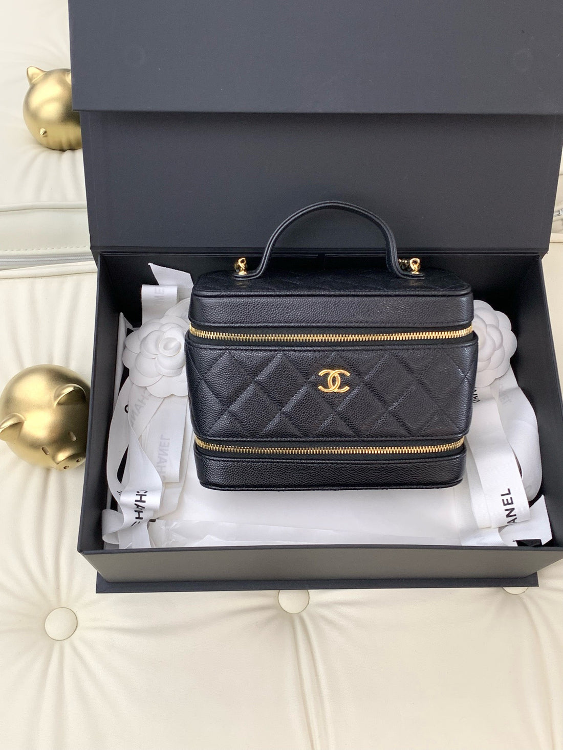 Chanel quilted vanity case with handle, made of grained calfskin, black.