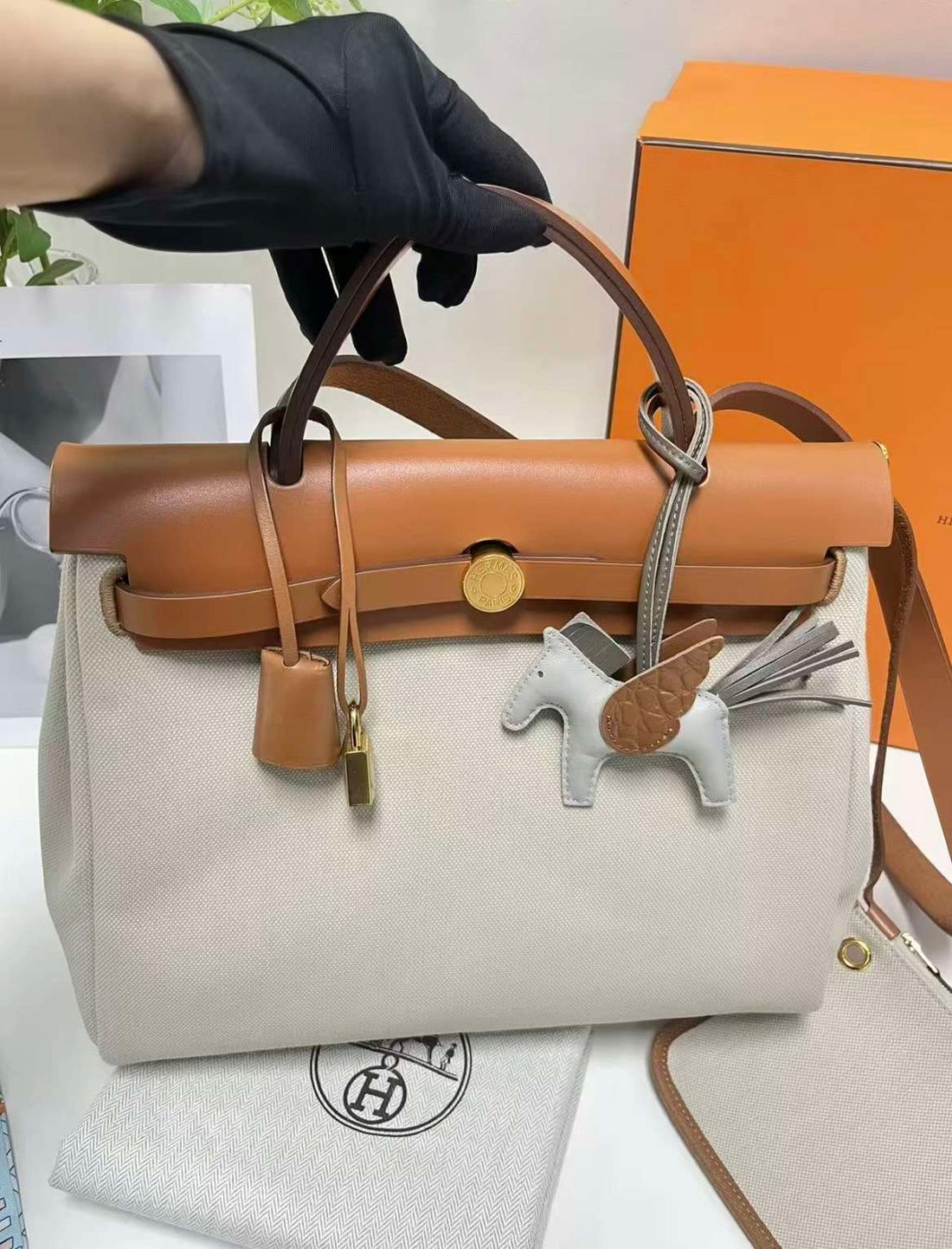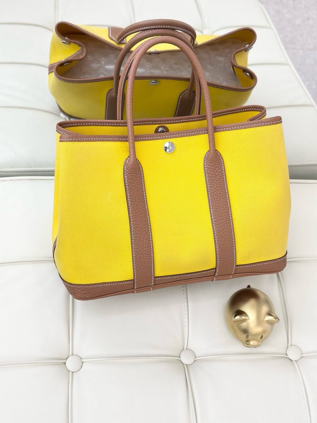 HERMES Garden Party 30 tote bag in yellow canvas with brown leather handles and palladium-plated hardware
