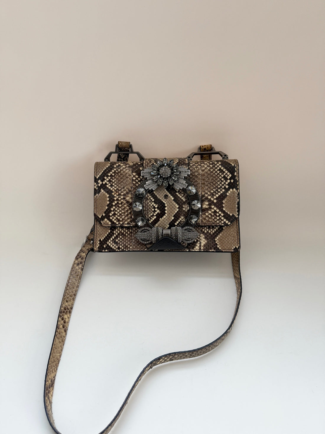 Miu Miu beige python skin crystal-embellished flap shoulder bag