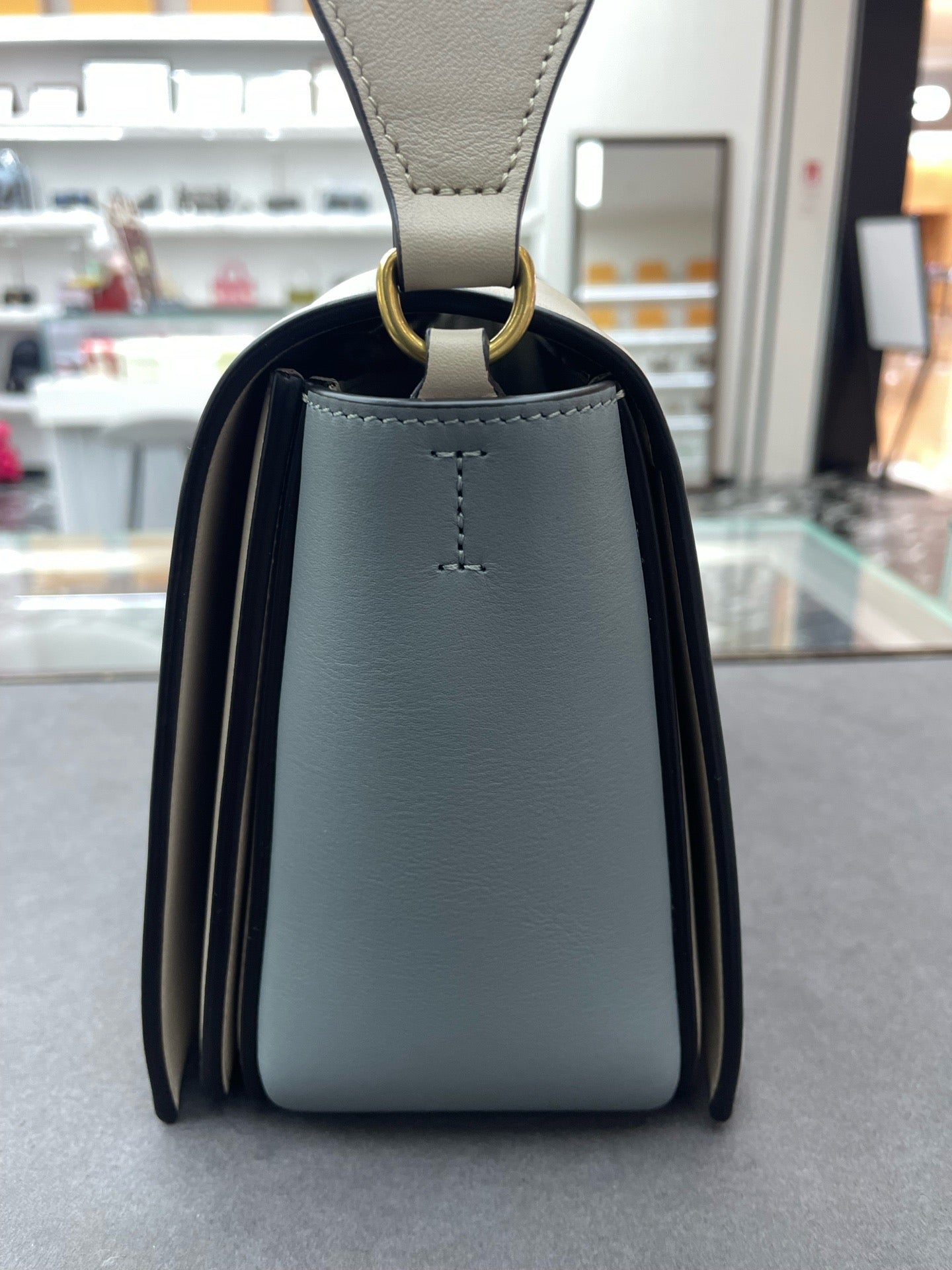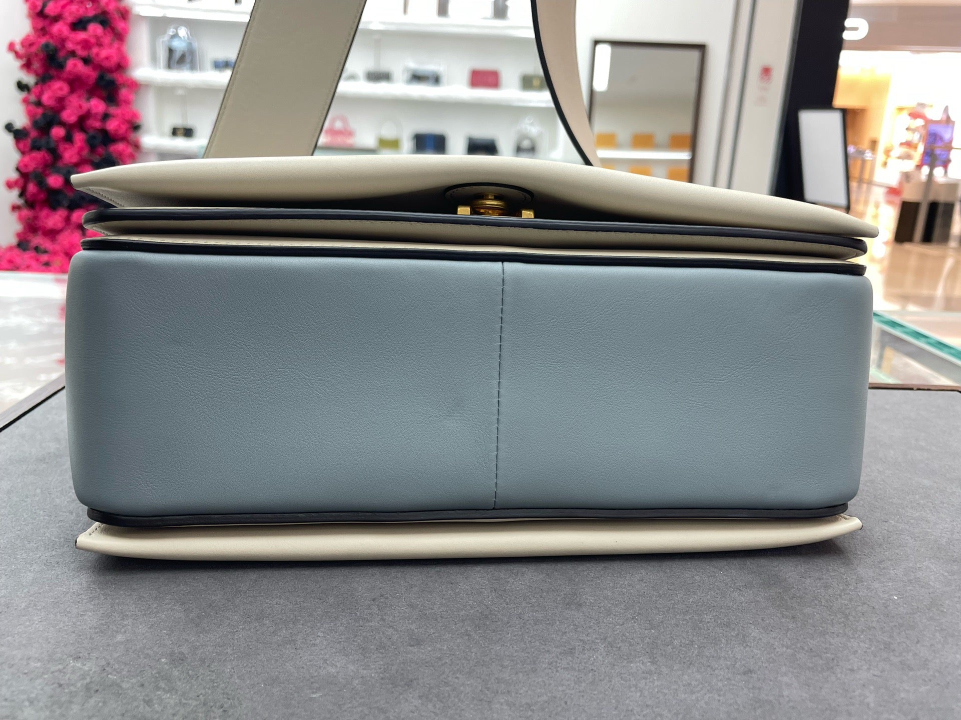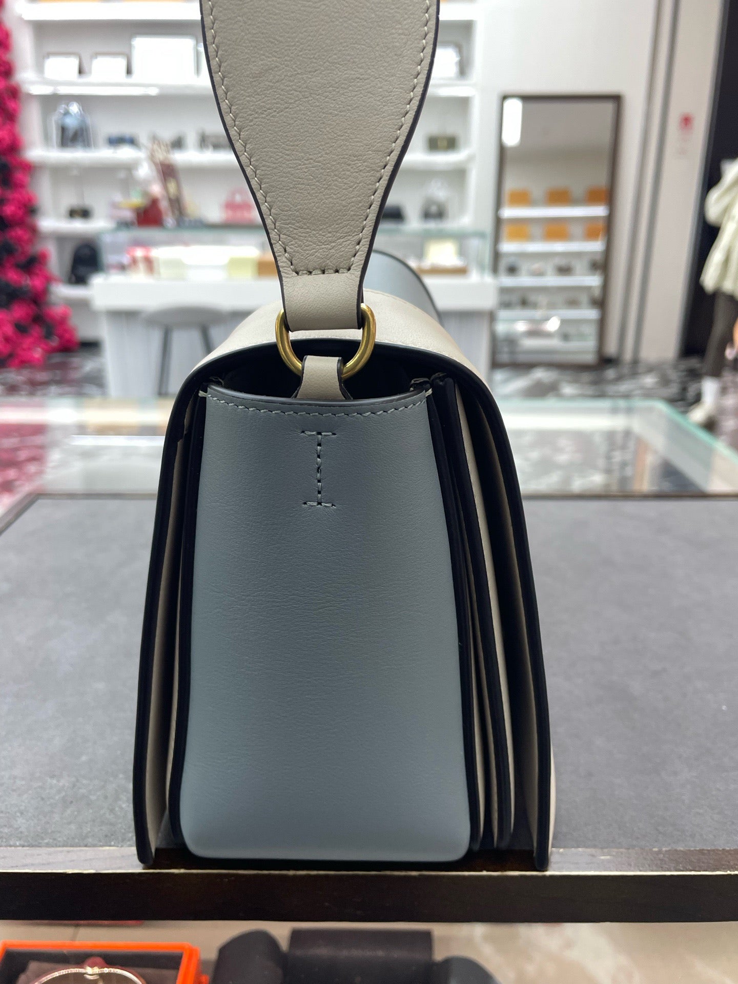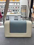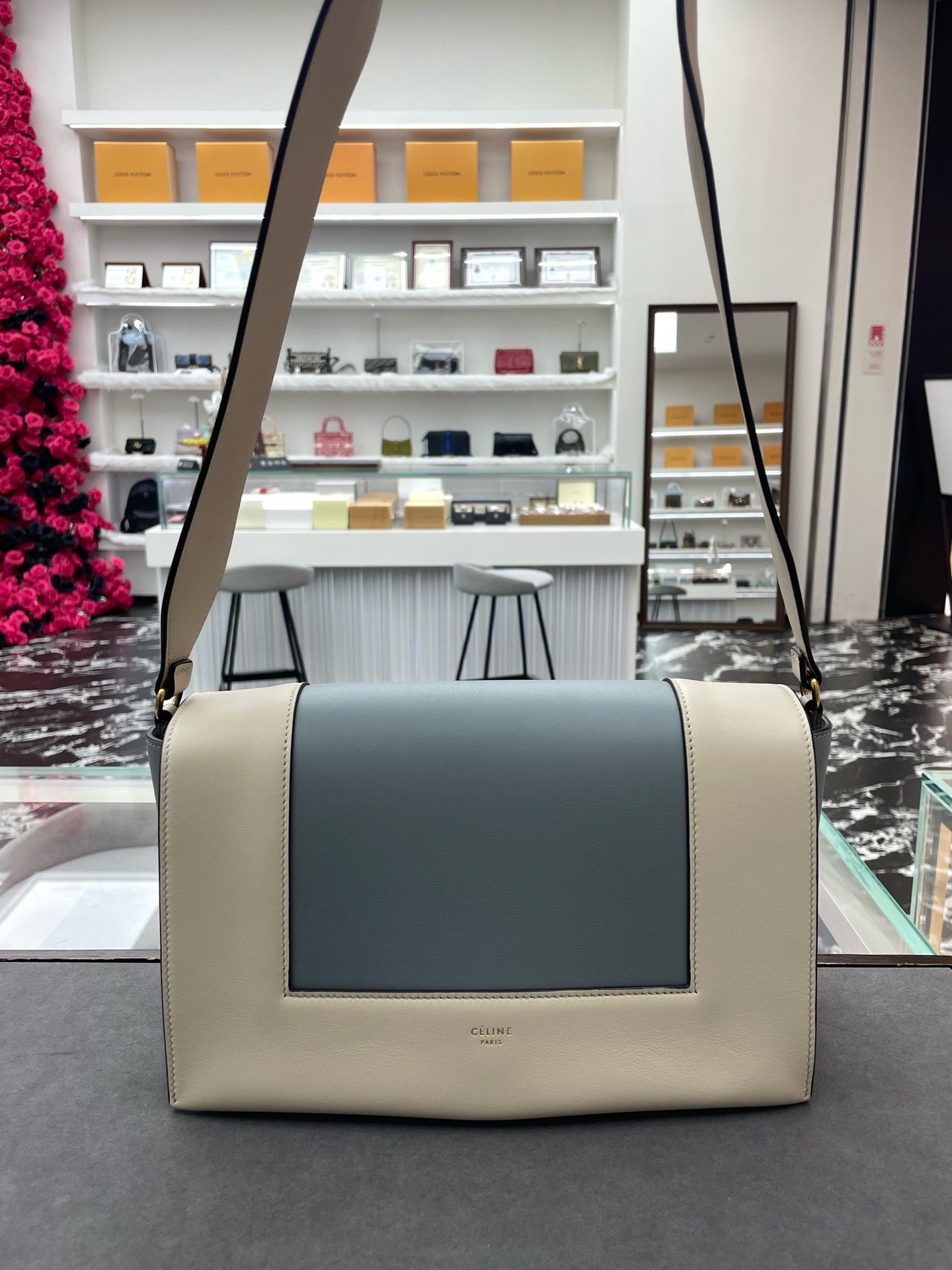 Celine Frame Bag, a flap-top tofu bag with a striking blue-grey color-block design.