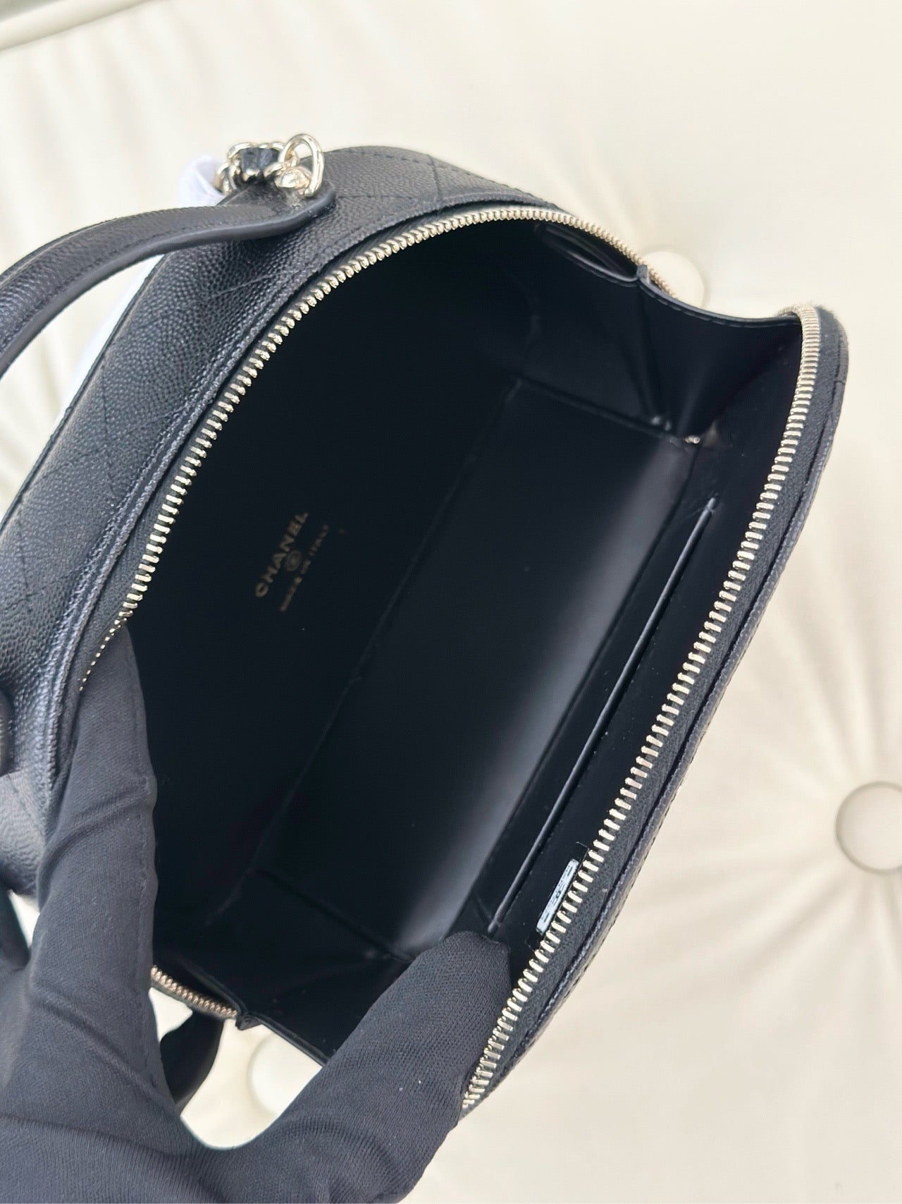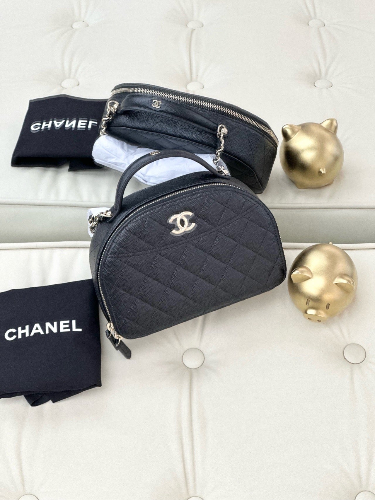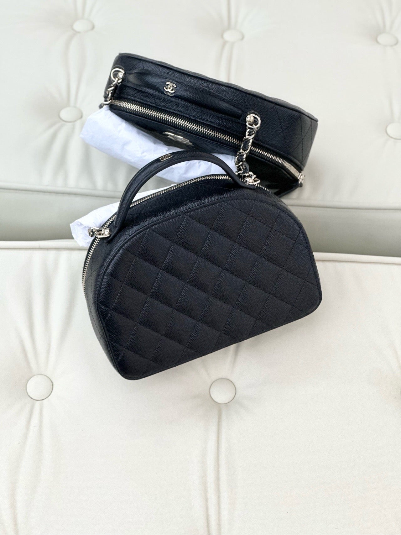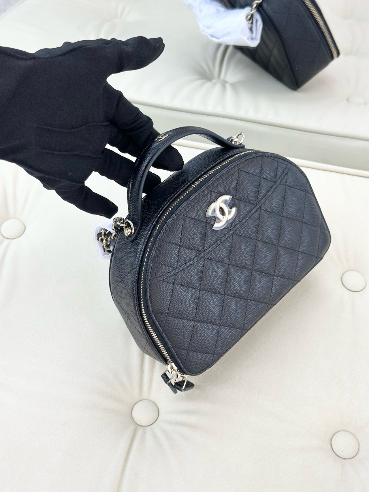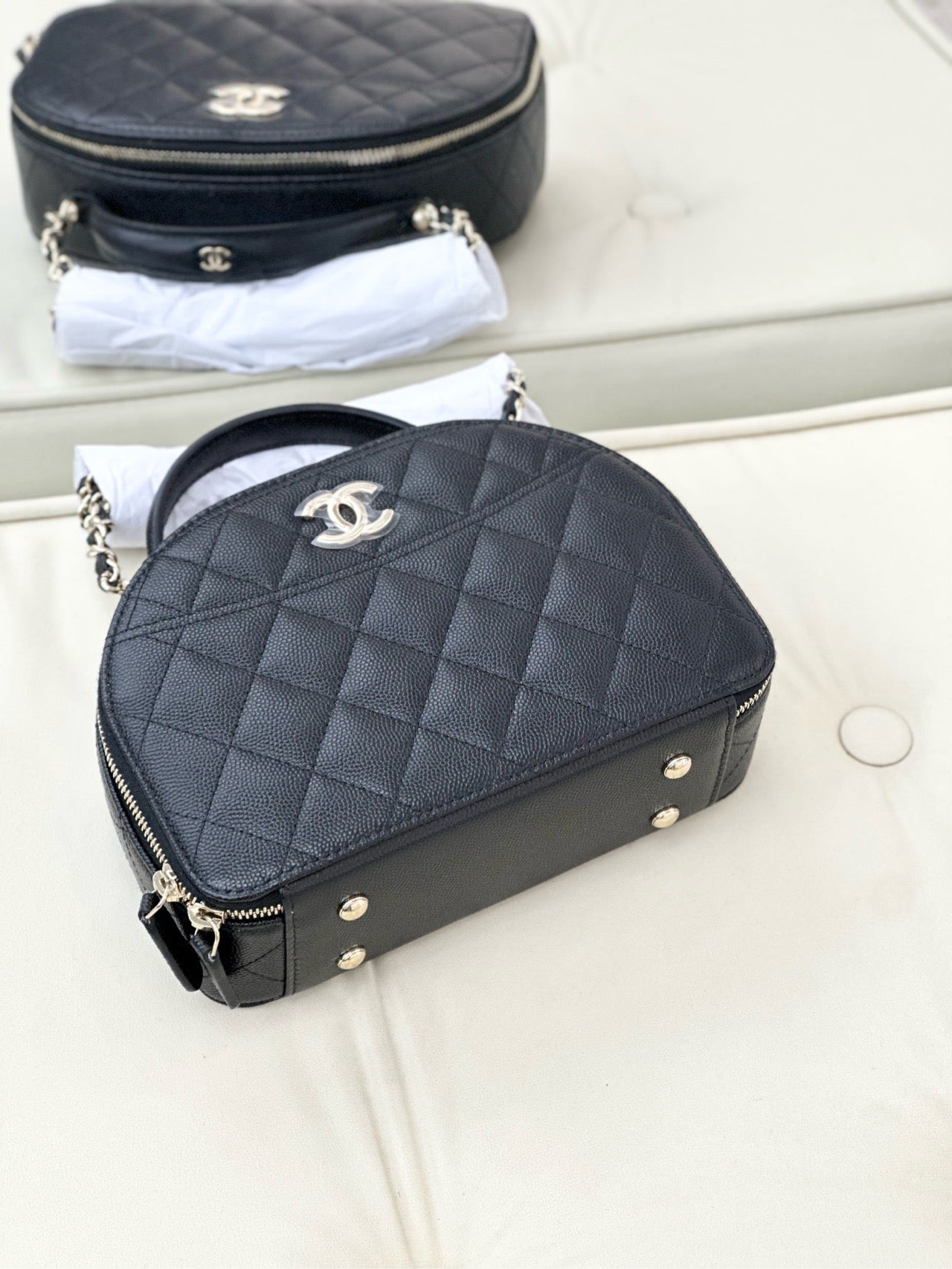 Chanel 25c black caviar leather half-round bowling bag with gold buckle