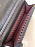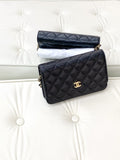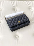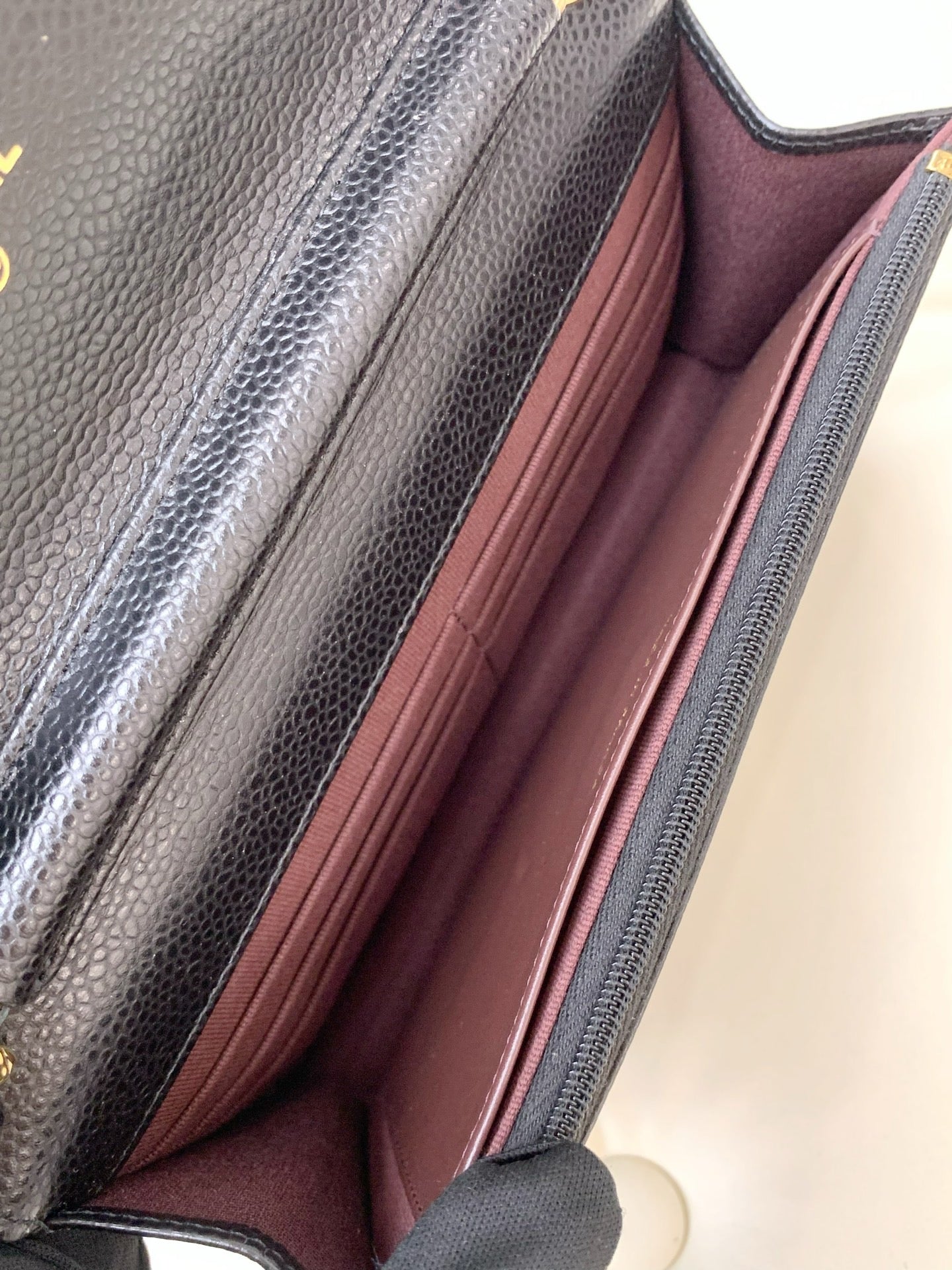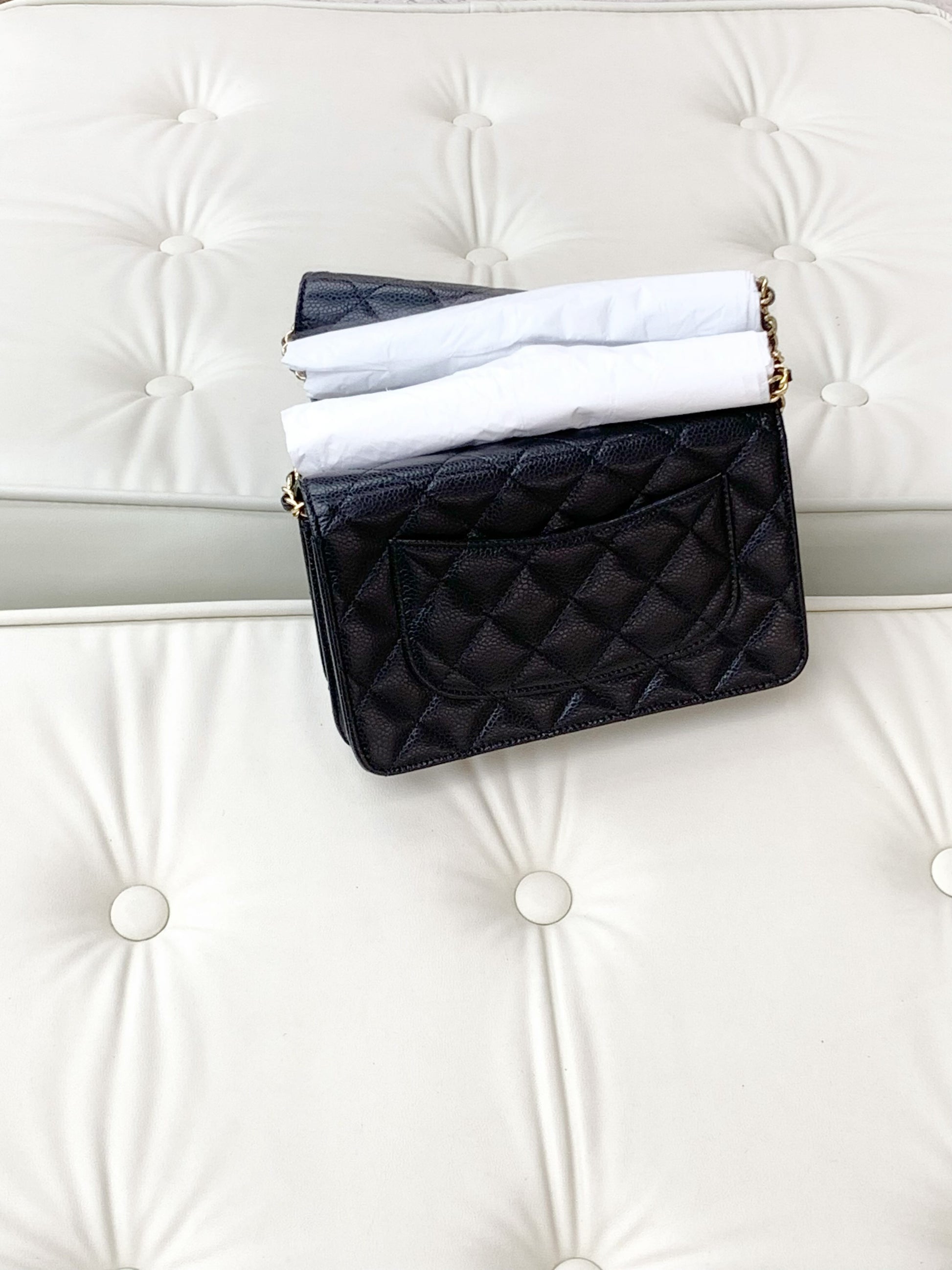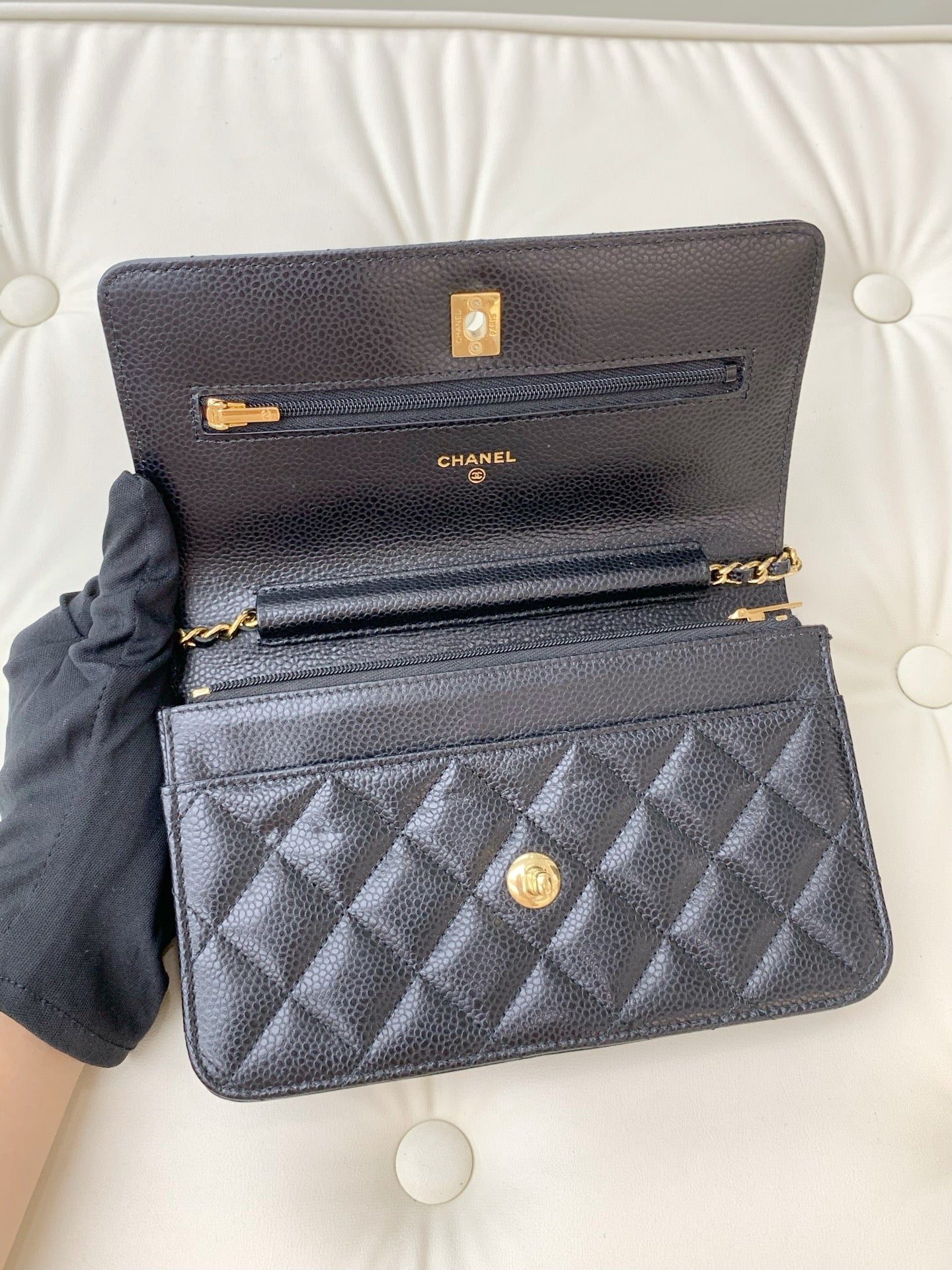 Chanel chain wallet with rotating clasp, caviar-textured leather, black.