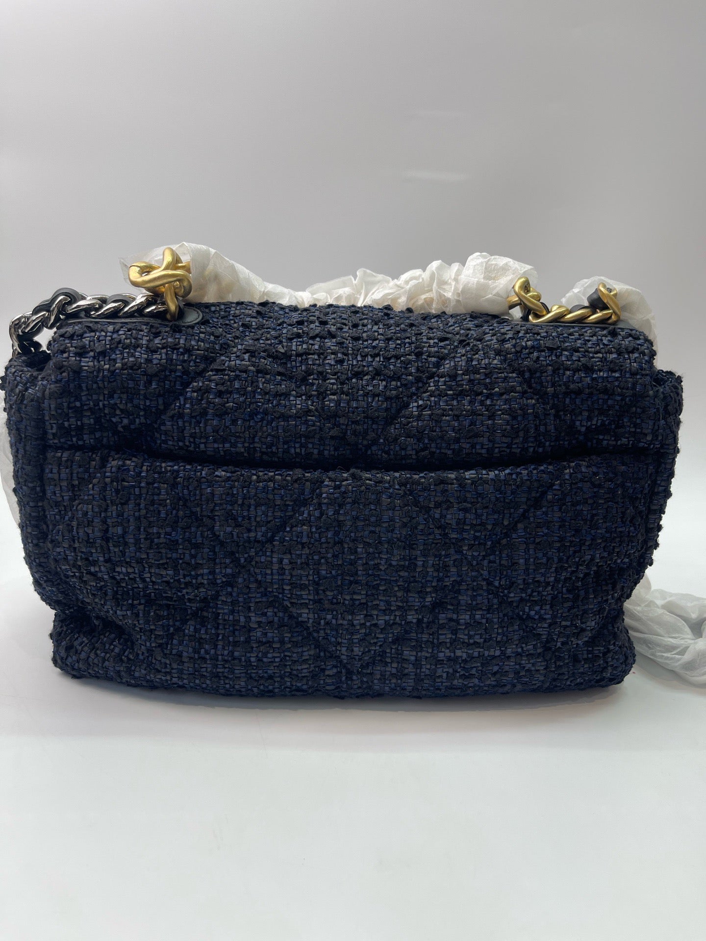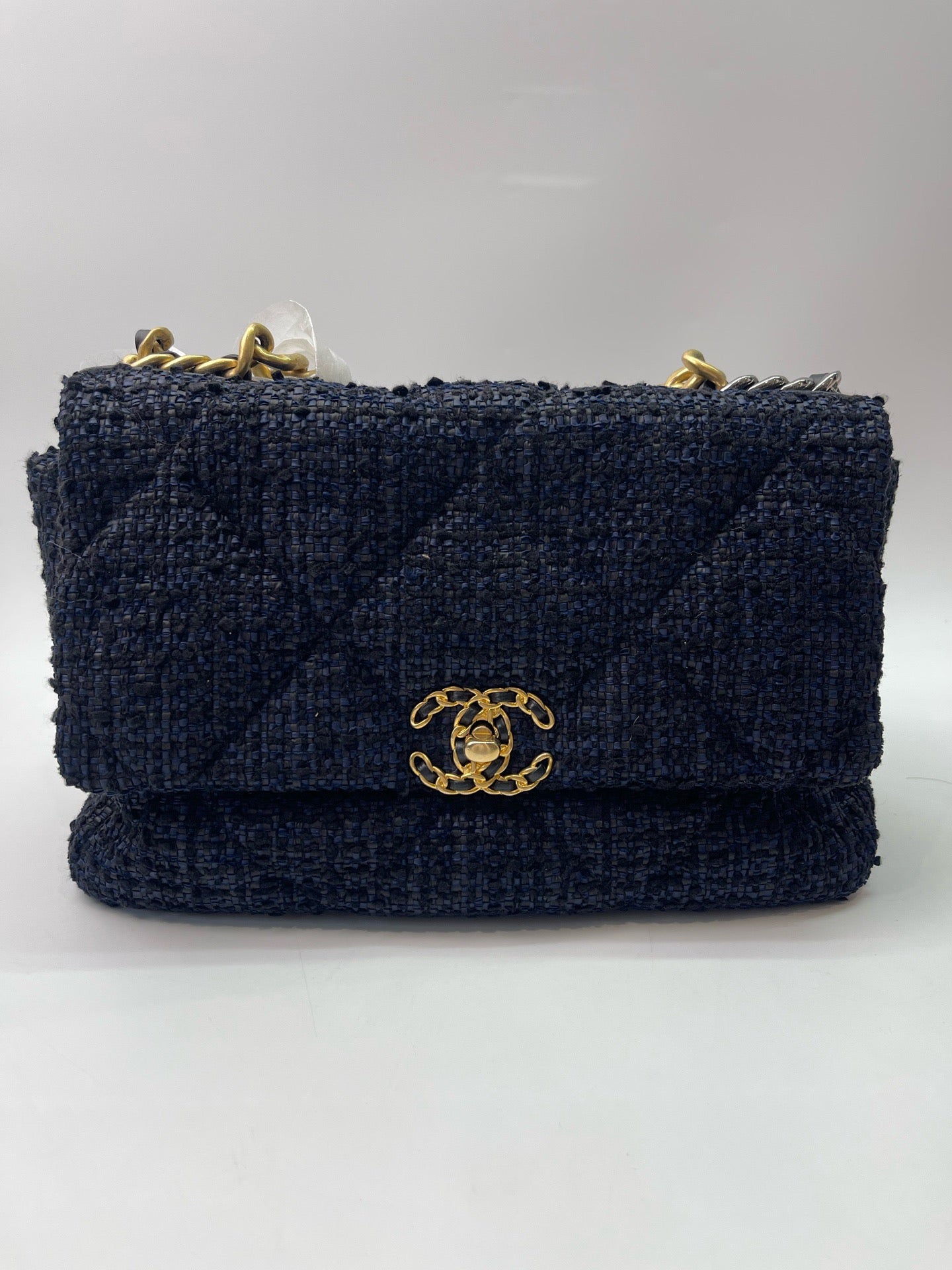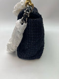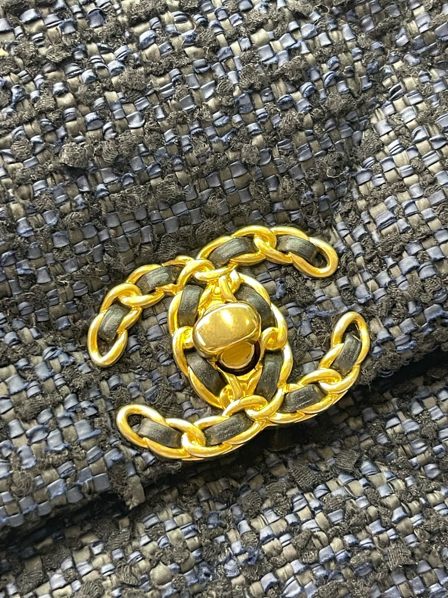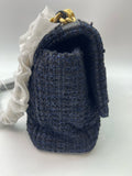 Chanel medium-sized navy blue flap tweed CC gold and grey chain shoulder bag