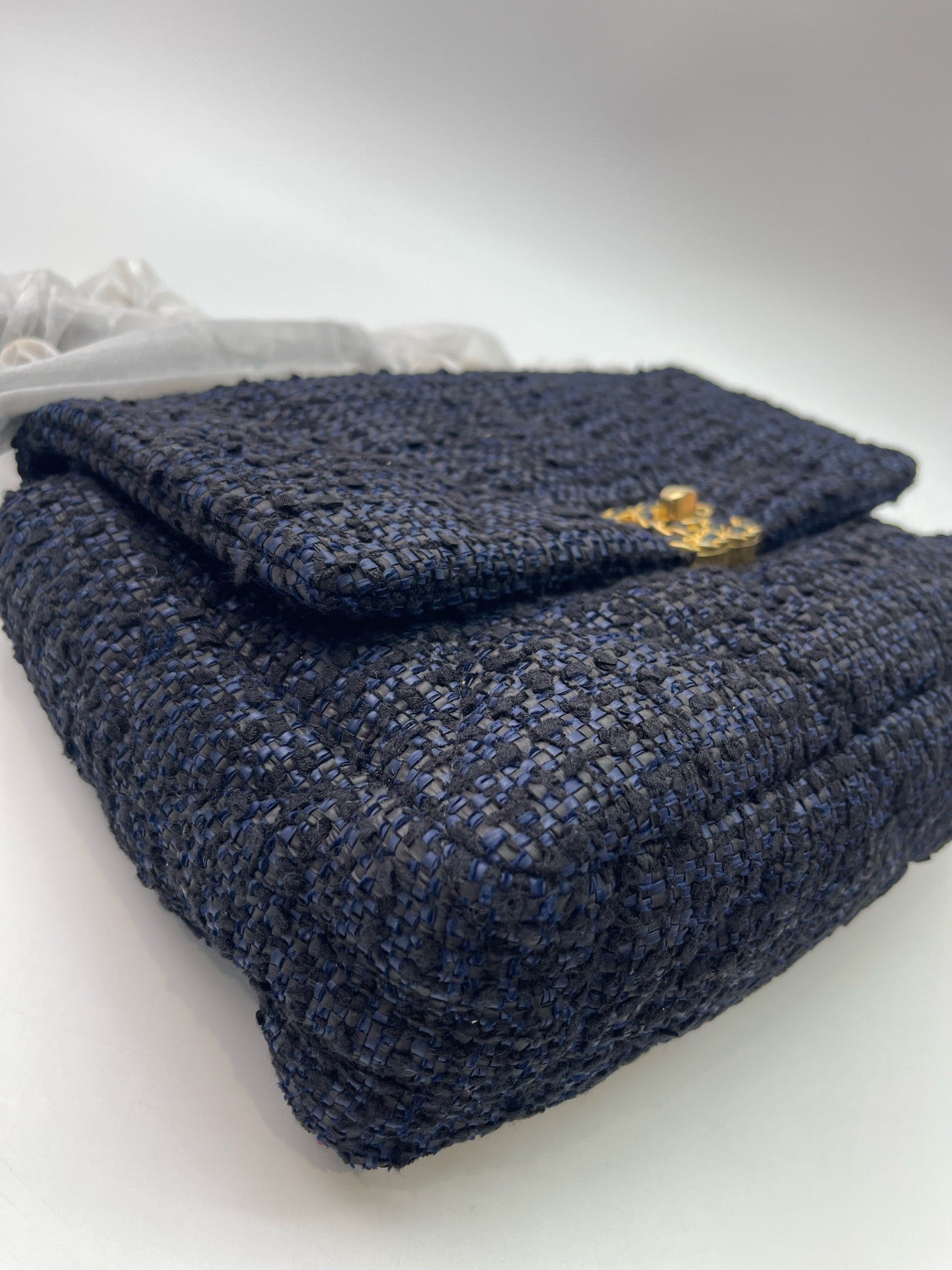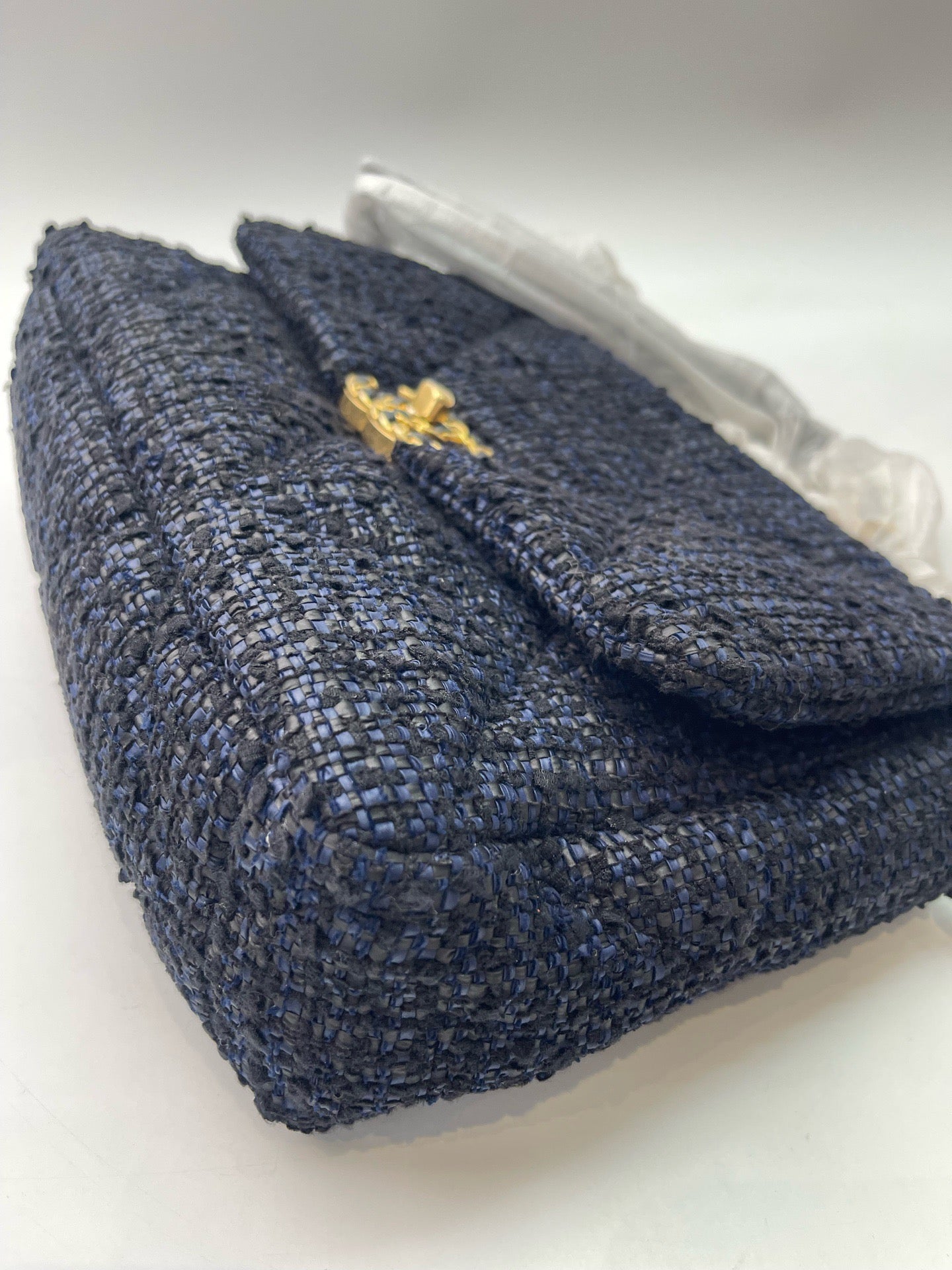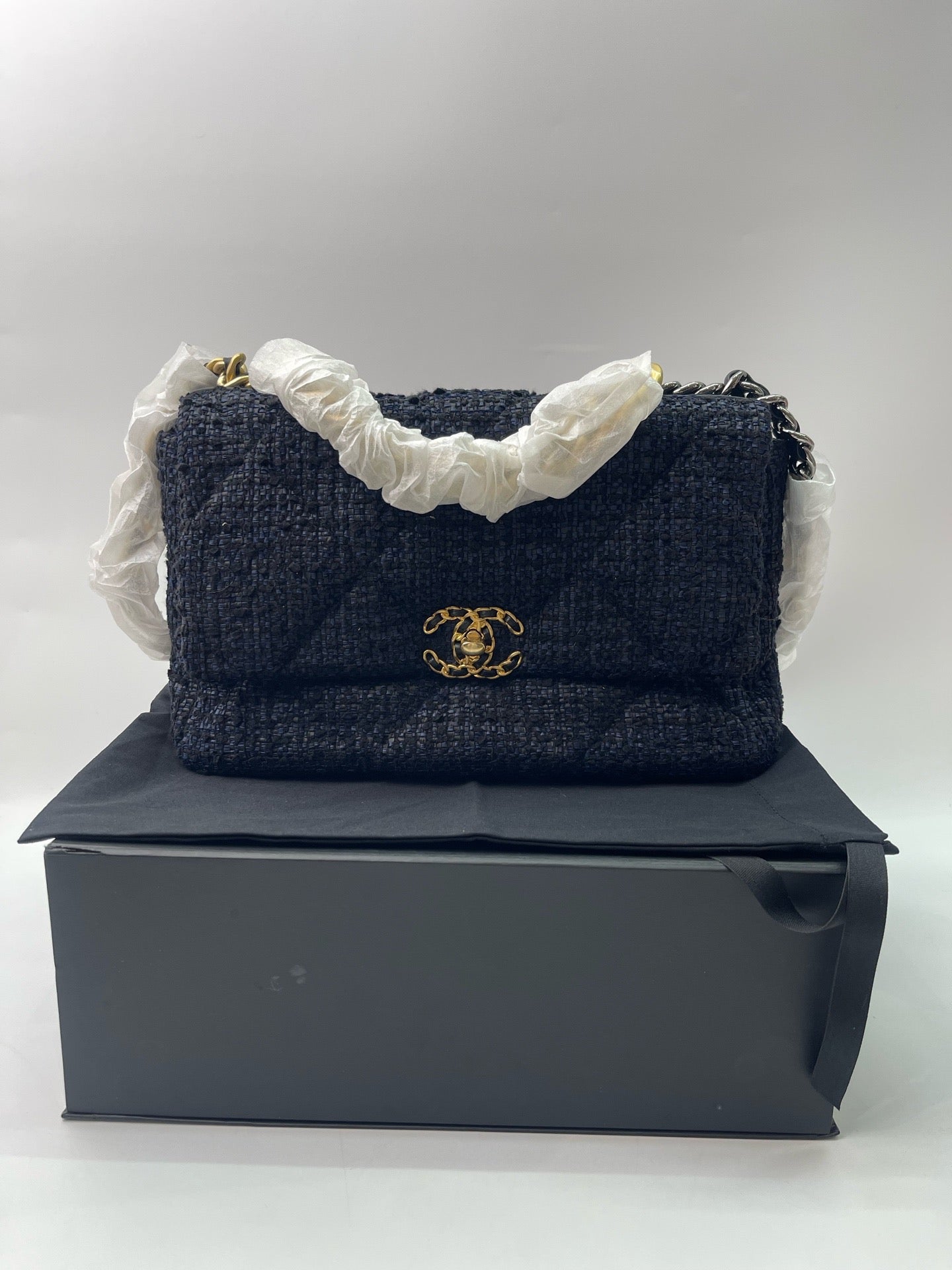 Chanel medium-sized navy blue flap tweed CC gold and grey chain shoulder bag