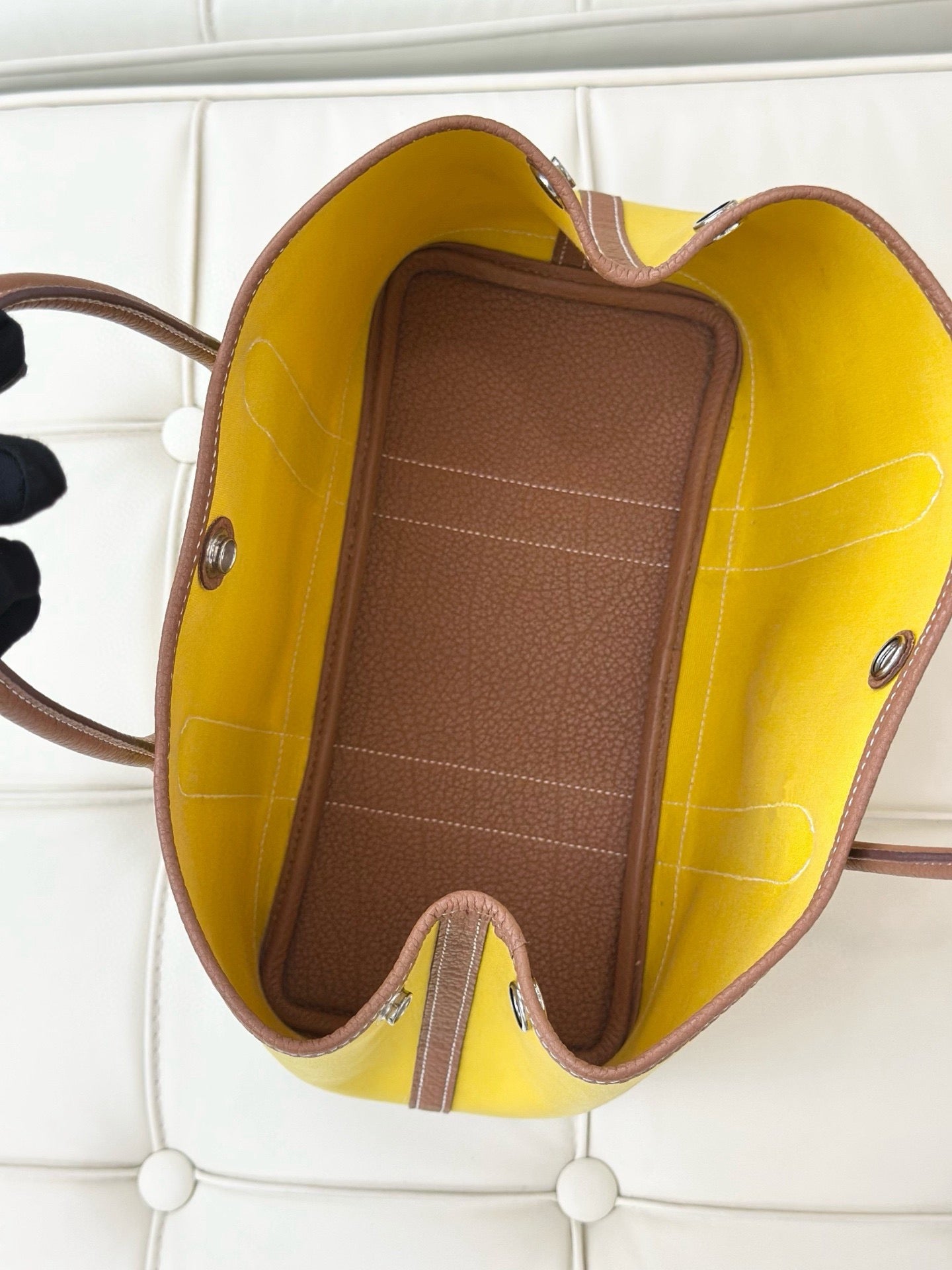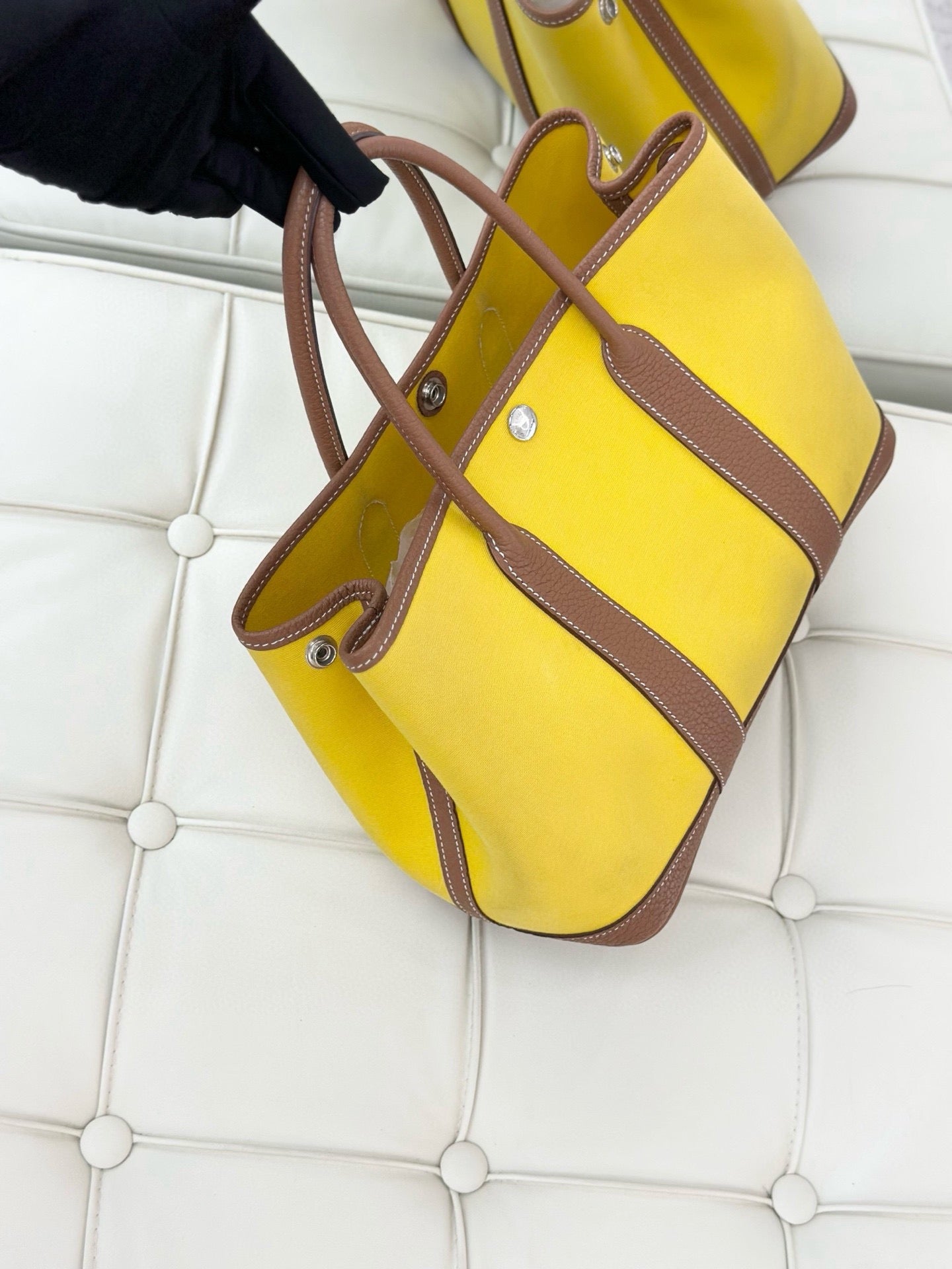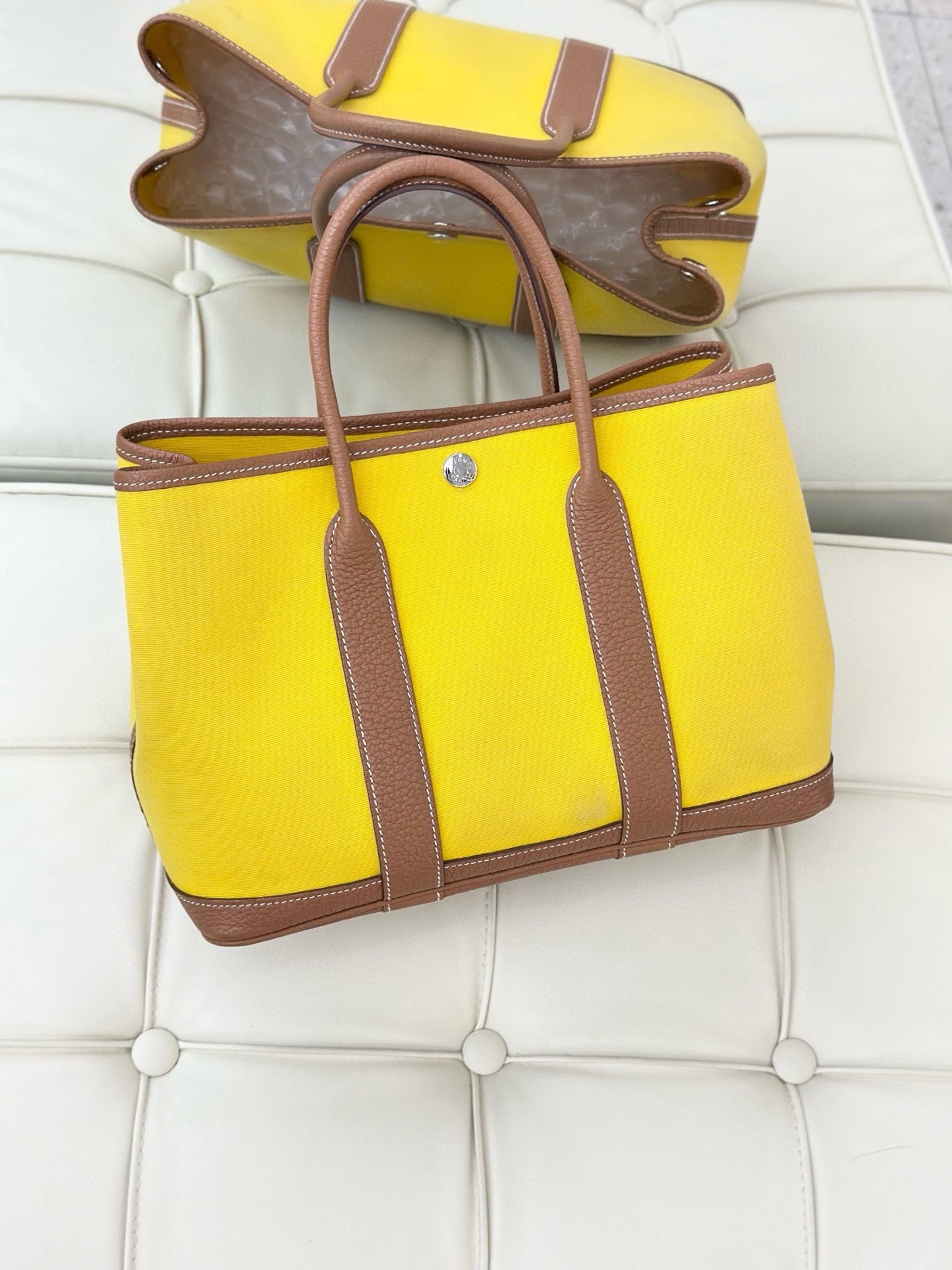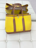 HERMES Garden Party 30 tote bag in yellow canvas with brown leather handles and palladium-plated hardware